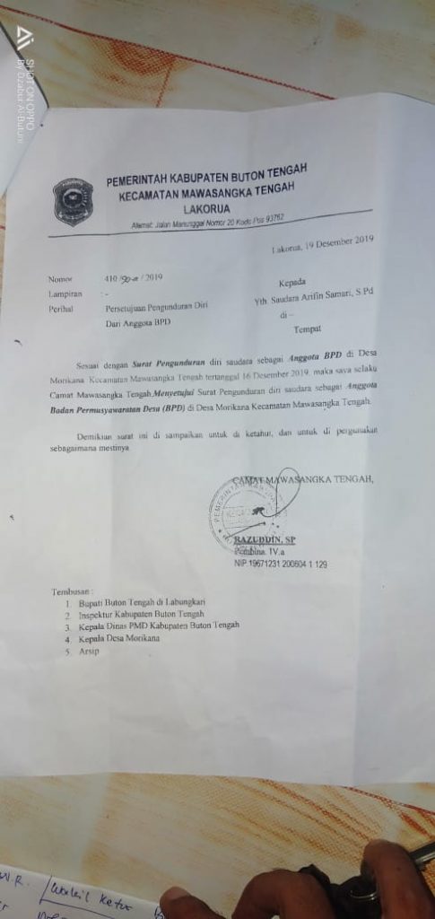 “Sehubungan denga kesibukan saya yang menurut saya begitu padat sehingga seringkali saya tidak maksimal menjalankan tugas saya sebagai anggota BPD di desa Morikana, olehnya itu saya melalui kesempatan ini menyampaikan untuk mengundurkan diri dari sejak tanggal penandatanganan surat ini. Morikana 16 Desember 2019, Arifin Samari, S.Pd,”