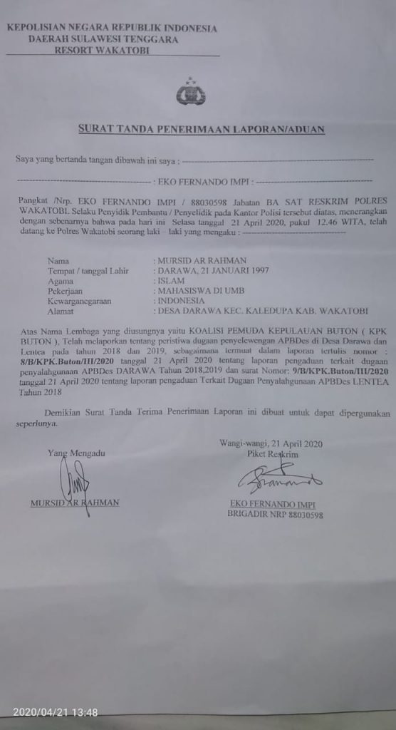 SATULIS.COM, Wakatobi – Diduga menyalahgunakan anggaran dana Desa, dua Kepala Desa (Kades) di Kabupaten Wakatobi, dilapor ke Satreskrim Polres Wakatobi oleh Koalisi Pemuda Kepulauan (KPK) Buton, Rabu (22/04/2020).