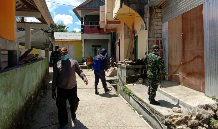 SATULIS.COM, Buton Selatan – Dalam memutuskan mata rantai penyebaran Covid-19, Danramil 1413/Sampolawa, Kapten inf. Isnadi Edi Darmawan bersinergi dengan Kapolsek Sampolawa, Iptu Imran serta relawan Covid-19 Kabupaten Buton Selatan (Busel), melakukan penyemprotan disinfektan, Sabtu (02/05/2020).